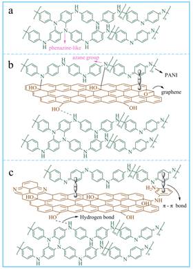 图2.(a)聚苯胺、(b)聚苯胺/石墨烯和(c)氮掺杂聚苯胺/石墨烯水凝胶分子反应机理图