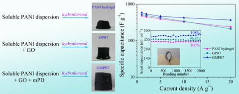 聚苯胺(PANI)作为一种典型的导电聚合物,因其高的赝电容、廉价、易合成等特性成为最受欢迎的超级电容电极材料之一,然而其低的倍率性能和循环稳定性限制了其在超级电容器中的应用。科研工作者采用PANI与碳基材料复合或制备成水凝胶来解决这些问题。PANI水凝胶常采用非电活性小分子作为交联剂或聚合物水凝胶作为基质通过原位聚合苯胺的方法来获得,合成的PANI水凝胶和复合水凝胶要么力学性能不好要么电化学性能不高。钟文斌教授课题组提出了PANI水热自交联的方法获得了高电化学性能和可任意弯曲的PANI水凝胶电极,并通过此方法获得了一系列高能量密度的PANI/石墨烯复合水凝胶柔性超级电容器电极,探讨了在水热过程中分子间以及与石墨烯之间的相互作用和对电化学性能的影响。
