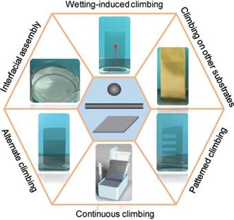 液体界面为石墨烯薄膜的组装和转移提供了一个理想平台。王建锋教授和江雷院士课题组成员合作发明了一种气-水界面组装/爬膜技术,实现了溶剂剥离石墨烯透明薄膜的快速、连续化组装和转移。将剥离的石墨烯分散液注射到水的表面,2分钟内在水表面形成了154平方厘米的透明石墨烯薄膜,接着将湿的基底插入水中,表面张力差驱动水表面的石墨烯薄膜以4.3毫米每秒的平均速度自发攀爬至基底上。